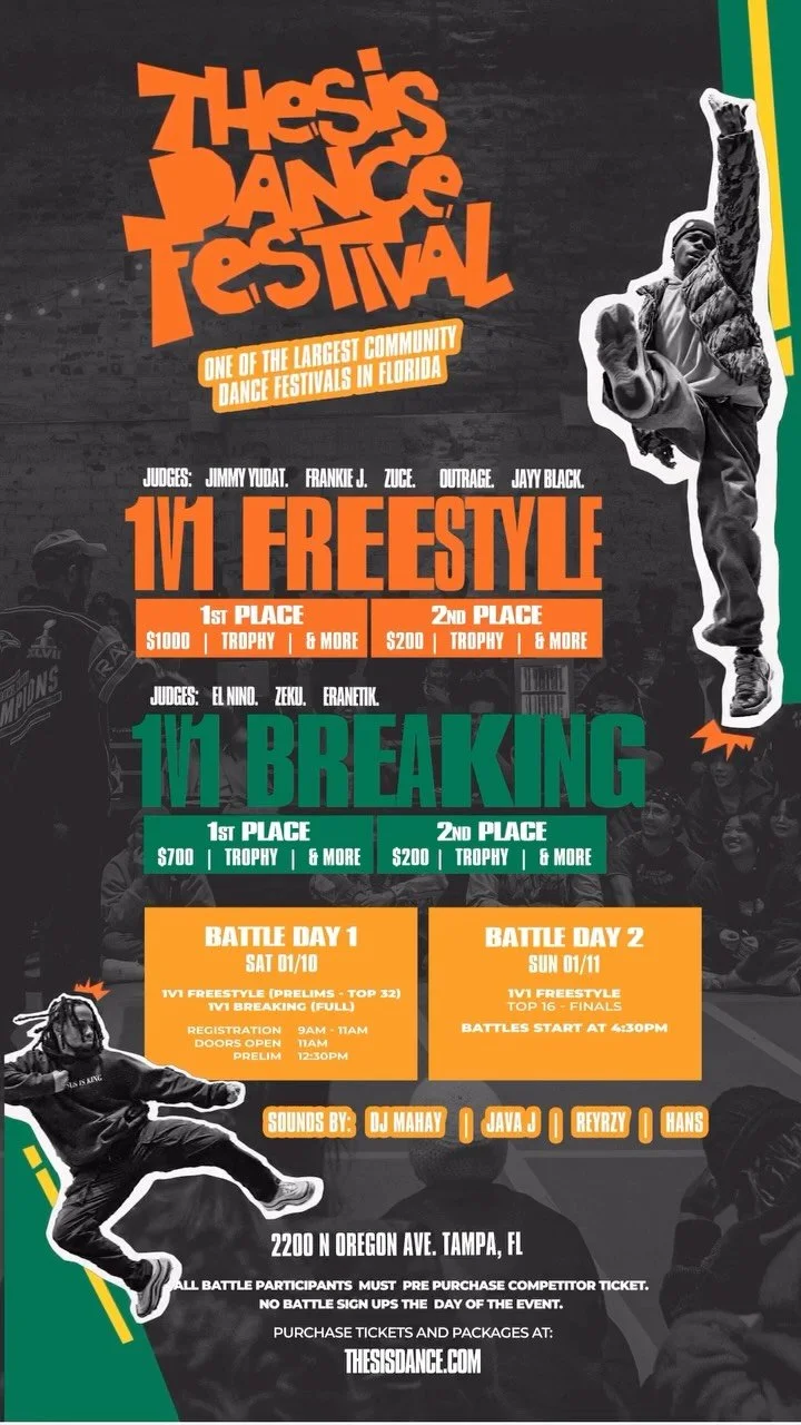 Thesis Dance (Est. 2015) is the largest COMMUNITY dance festival in all of Florida. People from all over the world come to experience the festivities & leave with full hearts, tired bodies, & an overabundance of anticipation for the return of the event. This weekend-long experience takes place in Tampa Bay & consists of four main parts: a pre-party, showcase, battle, and workshop.